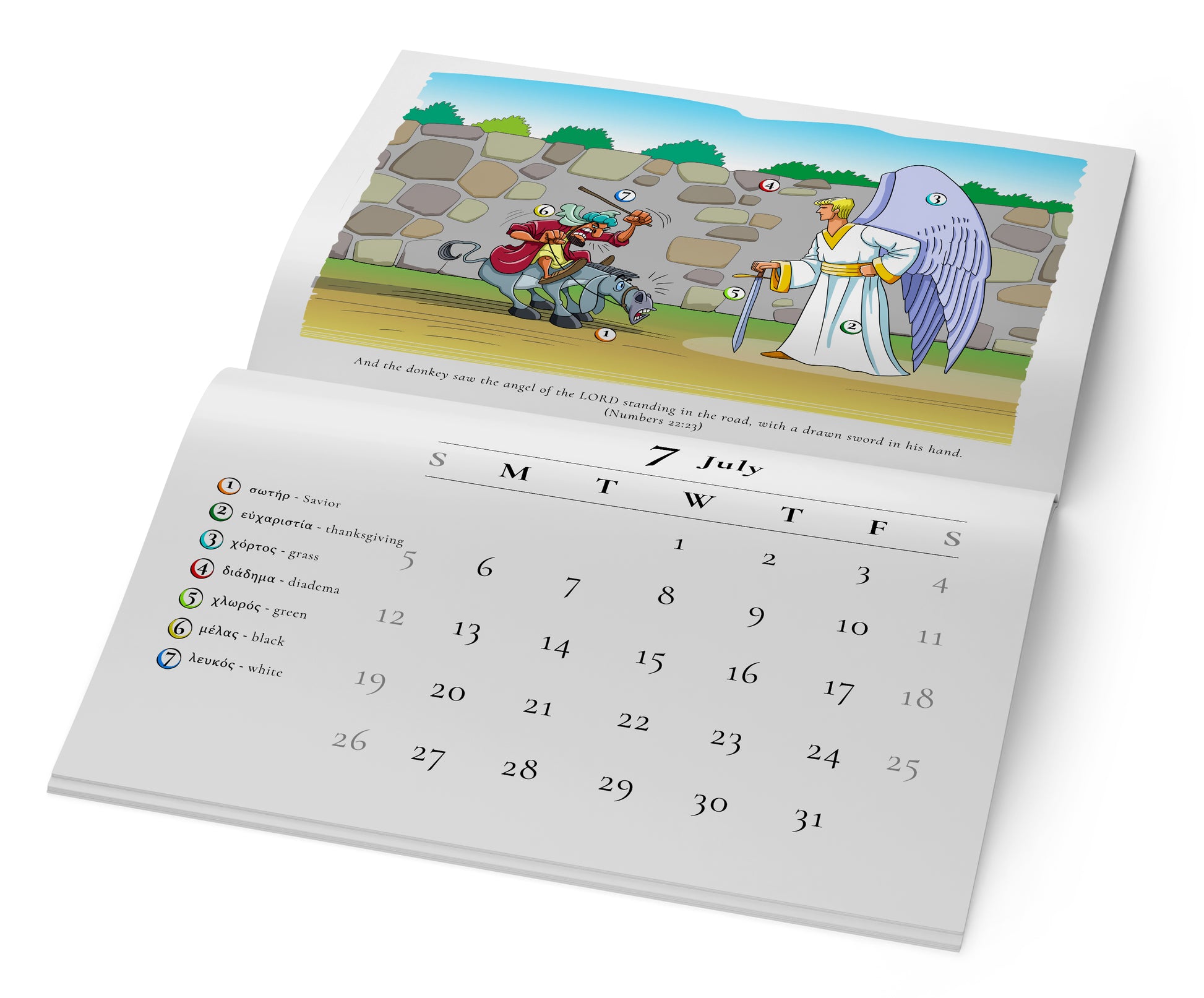 Beautifully illustrated 12 Old Testament stories with Bible verses. Each illustration contains seven Hebrew words with translation, so you could learn a few words from the original language.